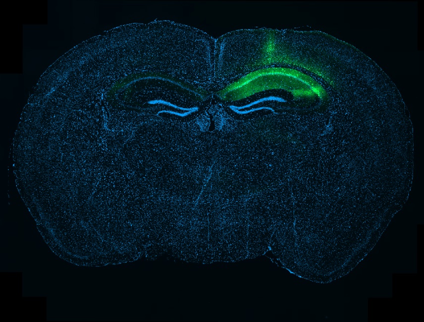Banner image: Whole-brain section showing local tau expression in the hippocampus after a targeted injection, visible here as the green signal on one side of the brain. Credit: Robert Ellingford