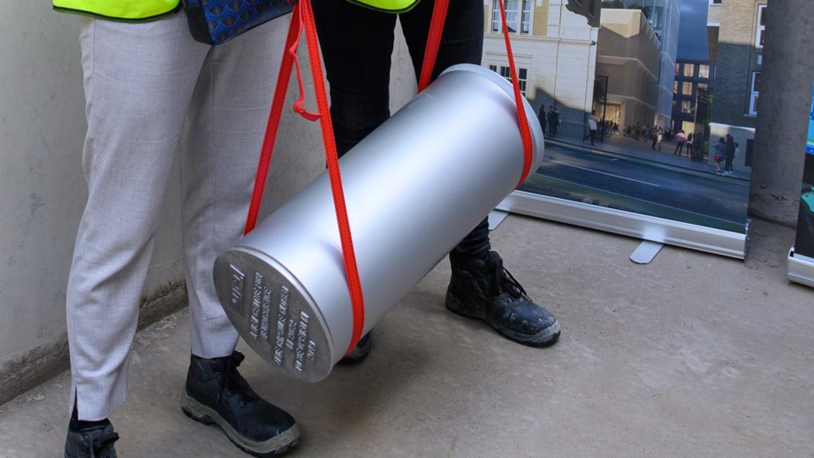 An Iceland plastic carrier bag, a Covid-19 vaccine vial and a piece of stainless steel have been buried in a time capsule of a new world-class centre for neuroscience at UCL, and the future home of the UK DRI hub, currently in construction on Grays Inn Road, London. The capsule was placed in the building’s foundations today (Thursday 19 May) as part of Dementia Action Week.